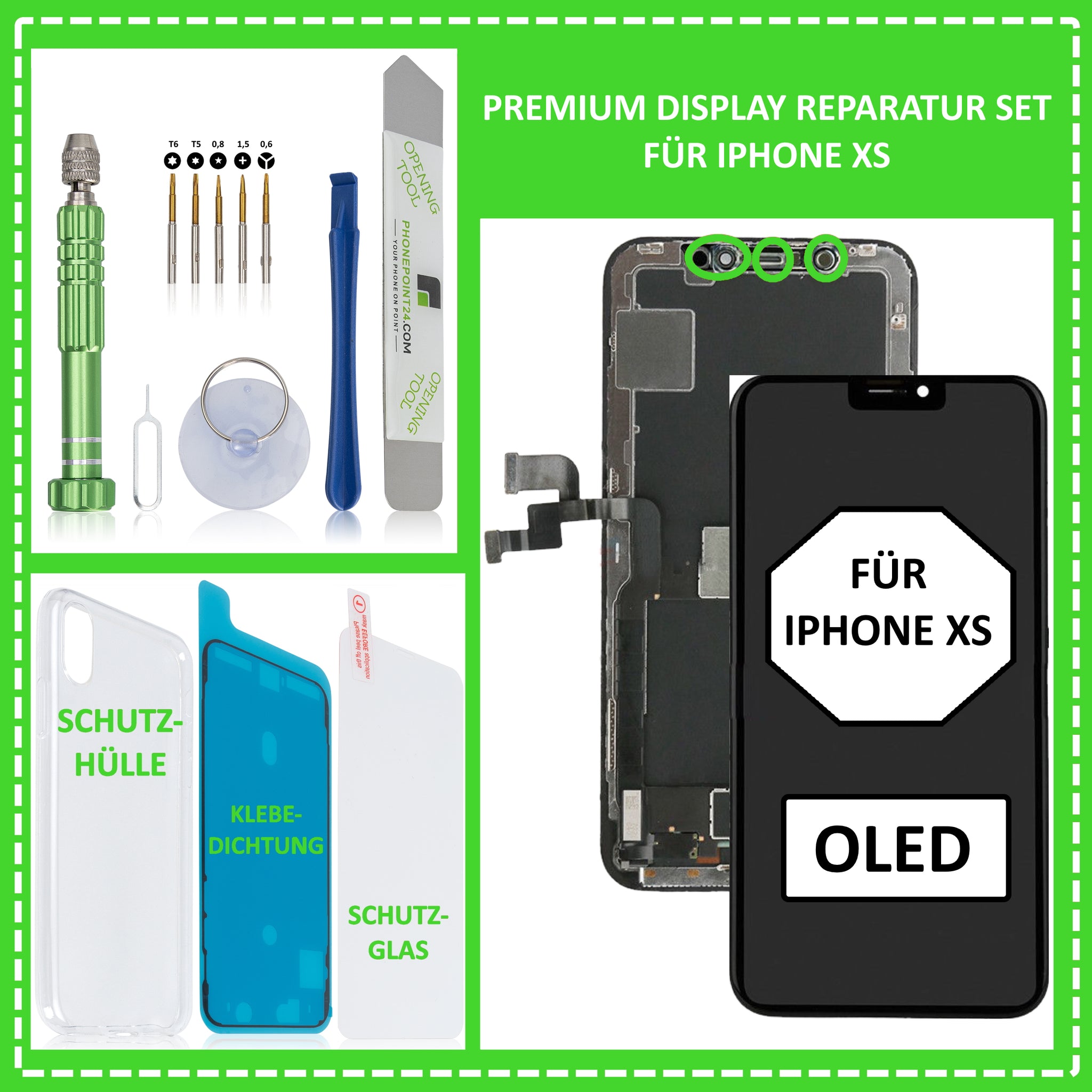 Ihnen ist Ihr iPhone XS heruntergefallen, sodass dabei das Display beschädigt wurde? Eine Reparatur in einer Fachwerkstatt ist Ihnen zu teuer ? Dann sind Sie hier genau richtig. Mit unserem iPhone XS OLED Premium Display Reparatur Set haben Sie nun die Möglichkeit Ihr iPhone XS Display einfach und kostengünstig selber zu reparieren. Hierzu verwenden Sie einfach das mitgelieferte hochwertige und magnetische Werkzeugset und die passende Klebedichtung. Zudem erhalten Sie gratis noch ein passendes Schutzglas und eine Silikonhülle dazu. Bei dem Display handelt es sich um OLED Display, also qualitativ wie das von Werk aus verbaute Display und nicht um günstiges und minderwertigeres LCD Display. Es ist nagelneu, von höchster Qualität und vollständig auf Funktion geprüft.