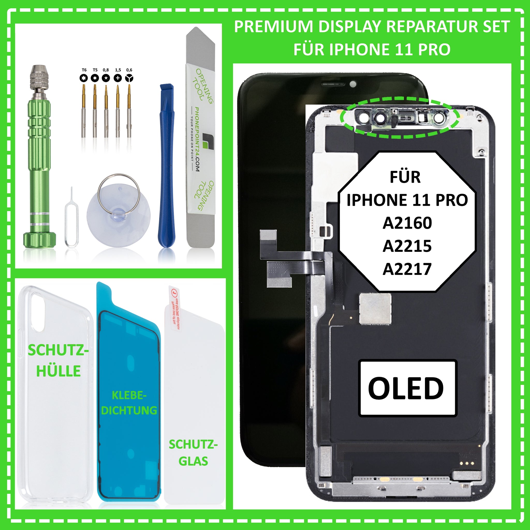 Ihnen ist Ihr iPhone 11 Pro heruntergefallen, sodass dabei das Display beschädigt wurde? Eine Reparatur in einer Fachwerkstatt ist Ihnen zu teuer ? Dann sind Sie hier genau richtig. Mit unserem iPhone 11 Pro OLED Premium Profi Display Reparatur Set haben Sie nun die Möglichkeit Ihr iPhone 11 Pro Display einfach und kostengünstig selber zu reparieren. Hierzu verwenden Sie einfach das mitgelieferte hochwertige und magnetische Werkzeugset und die Klebedichtung. Zudem erhalten Sie gratis noch ein passendes Schutzglas, sowie eine passende Schutzhülle dazu. Bei dem Display handelt es sich um OLED Display, also qualitativ wie das von Werk aus verbaute Display und nicht um günstiges und minderwertigeres LCD Display. Es ist nagelneu, von höchster Qualität und vollständig auf Funktion geprüft.