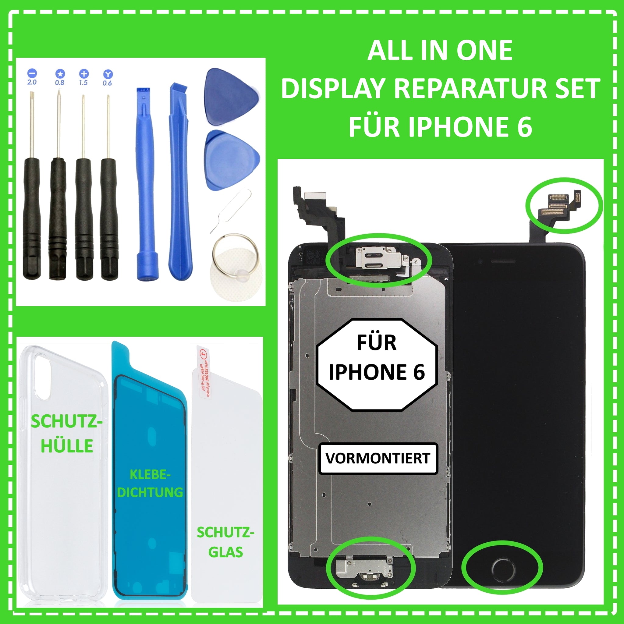 Ihnen ist Ihr iPhone 6 heruntergefallen, sodass dabei das Display beschädigt wurde? Eine Reparatur in einer Fachwerkstatt ist Ihnen zu teuer ? Dann sind Sie hier genau richtig. Mit unserem iPhone 6 Premium Display Reparatur Set haben Sie nun die Möglichkeit Ihr iPhone 6 Display einfach und kostengünstig selber zu reparieren. Hierzu verwenden Sie einfach das mitgelieferte 10-teilige Werkzeugset und die Klebedichtung. Zudem erhalten Sie gratis noch ein passendes Schutzglas und eine Silikonhülle dazu. Außerdem ist das Display bereits einbaufertig. Das heißt, dass Teile wie Frontkamera, Hörmuschel, Sensoren, Hitzeblech und Home Button bereits vormontiert sind. Alle verwendeten Teile sind nagelneu, von höchster Qualität und vollständig auf Funktion geprüft.