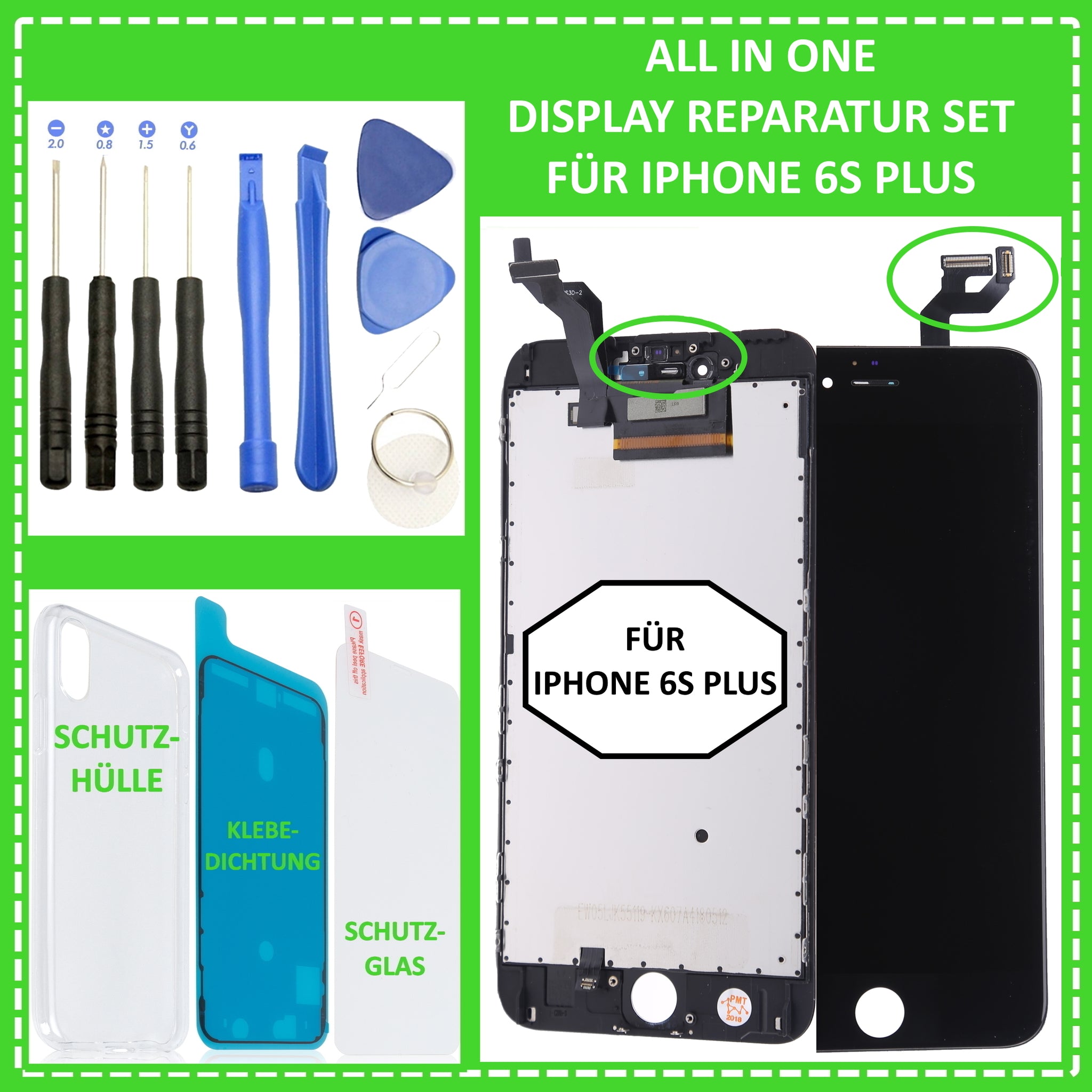 Ihnen ist Ihr iPhone 6s Plus heruntergefallen, sodass dabei das Display beschädigt wurde? Eine Reparatur in einer Fachwerkstatt ist Ihnen zu teuer ? Dann sind Sie hier genau richtig. Mit unserem iPhone 6s Plus Premium Display Reparatur Set haben Sie nun die Möglichkeit Ihr iPhone 6s Plus Display einfach und kostengünstig selber zu reparieren. Hierzu verwenden Sie einfach das mitgelieferte 10-teilige Werkzeugset und die Klebedichtung. Zudem erhalten Sie gratis noch ein passendes Schutzglas und eine passende Schutzhülle dazu. Das Display und der Touchscreen sind nagelneu, von höchster Qualität und vollständig auf Funktion geprüft.