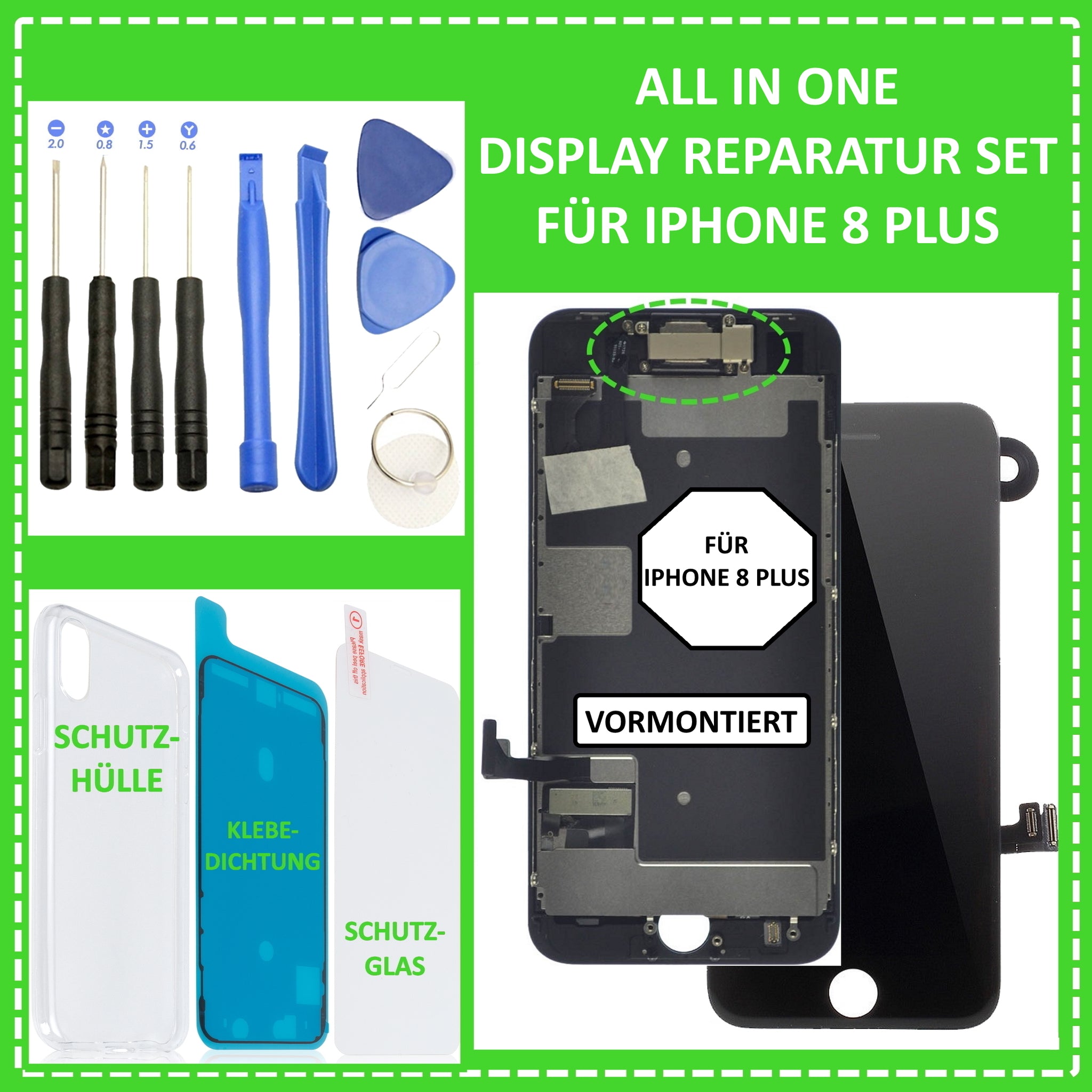 Ihnen ist Ihr iPhone 8 Plus heruntergefallen, sodass dabei das Display beschädigt wurde? Eine Reparatur in einer Fachwerkstatt ist Ihnen zu teuer ? Dann sind Sie hier genau richtig. Mit unserem iPhone 8 Plus Premium Display Reparatur Set haben Sie nun die Möglichkeit Ihr iPhone 8 Plus Display einfach und kostengünstig selber zu reparieren. Hierzu verwenden Sie einfach das mitgelieferte 10-teilige Werkzeugset und die Klebedichtung. Zudem erhalten Sie gratis noch ein passendes Schutzglas und eine Silikonhülle dazu. Außerdem ist das Display bereits einbaufertig. Das heißt, dass Teile wie Frontkamera, Hörmuschel, Sensoren und Hitzeblech bereits vormontiert sind. Alle verwendeten Teile sind nagelneu, von höchster Qualität und vollständig auf Funktion geprüft.
