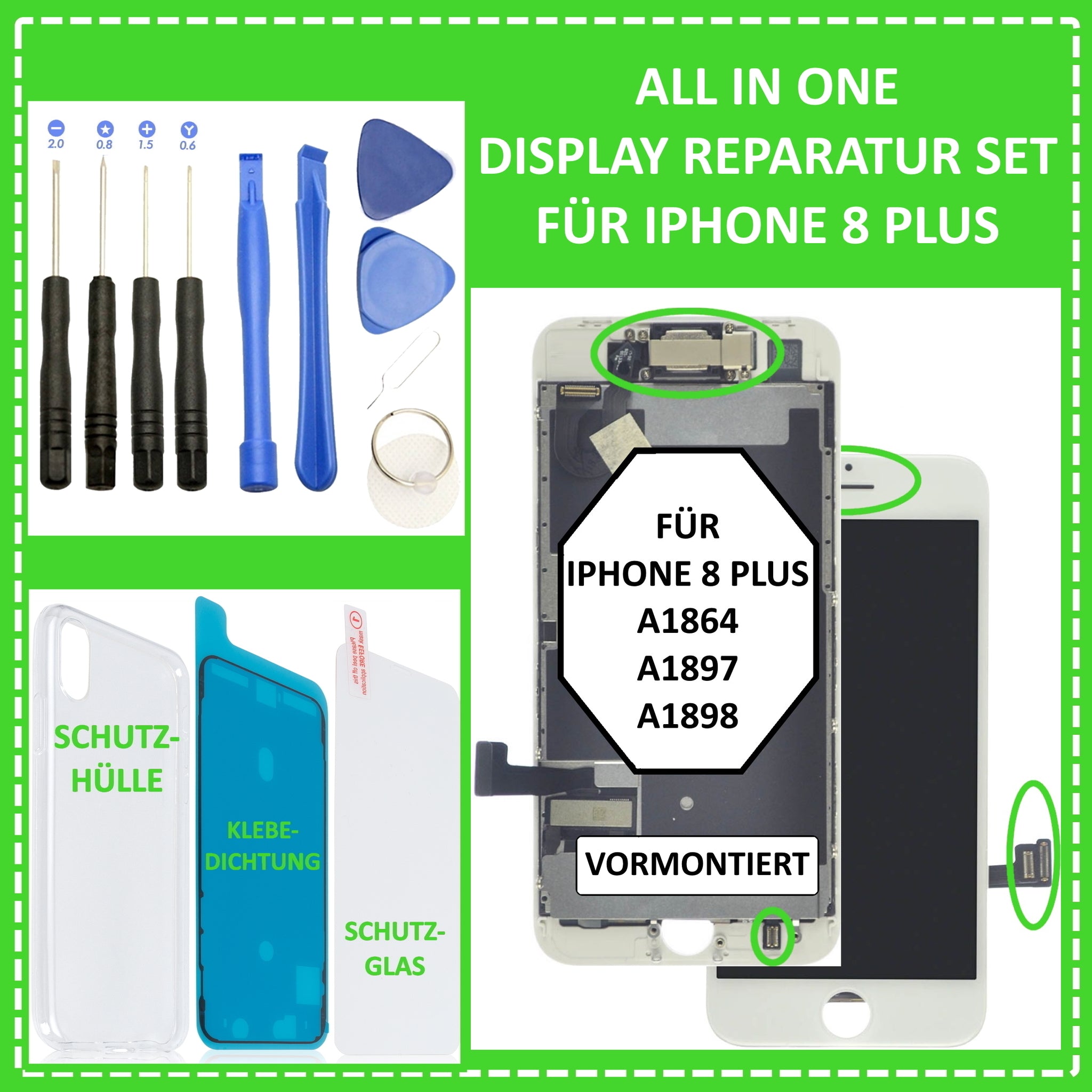 Ihnen ist Ihr iPhone 8 Plus heruntergefallen, sodass dabei das Display beschädigt wurde? Eine Reparatur in einer Fachwerkstatt ist Ihnen zu teuer ? Dann sind Sie hier genau richtig. Mit unserem iPhone 8 Plus Premium Display Reparatur Set haben Sie nun die Möglichkeit Ihr iPhone 8 Plus Display einfach und kostengünstig selber zu reparieren. Hierzu verwenden Sie einfach das mitgelieferte 10-teilige Werkzeugset und die Klebedichtung. Zudem erhalten Sie gratis noch ein passendes Schutzglas und eine Silikonhülle dazu. Außerdem ist das Display bereits einbaufertig. Das heißt, dass Teile wie Frontkamera, Hörmuschel, Sensoren und Hitzeblech bereits vormontiert sind. Alle verwendeten Teile sind nagelneu, von höchster Qualität und vollständig auf Funktion geprüft.