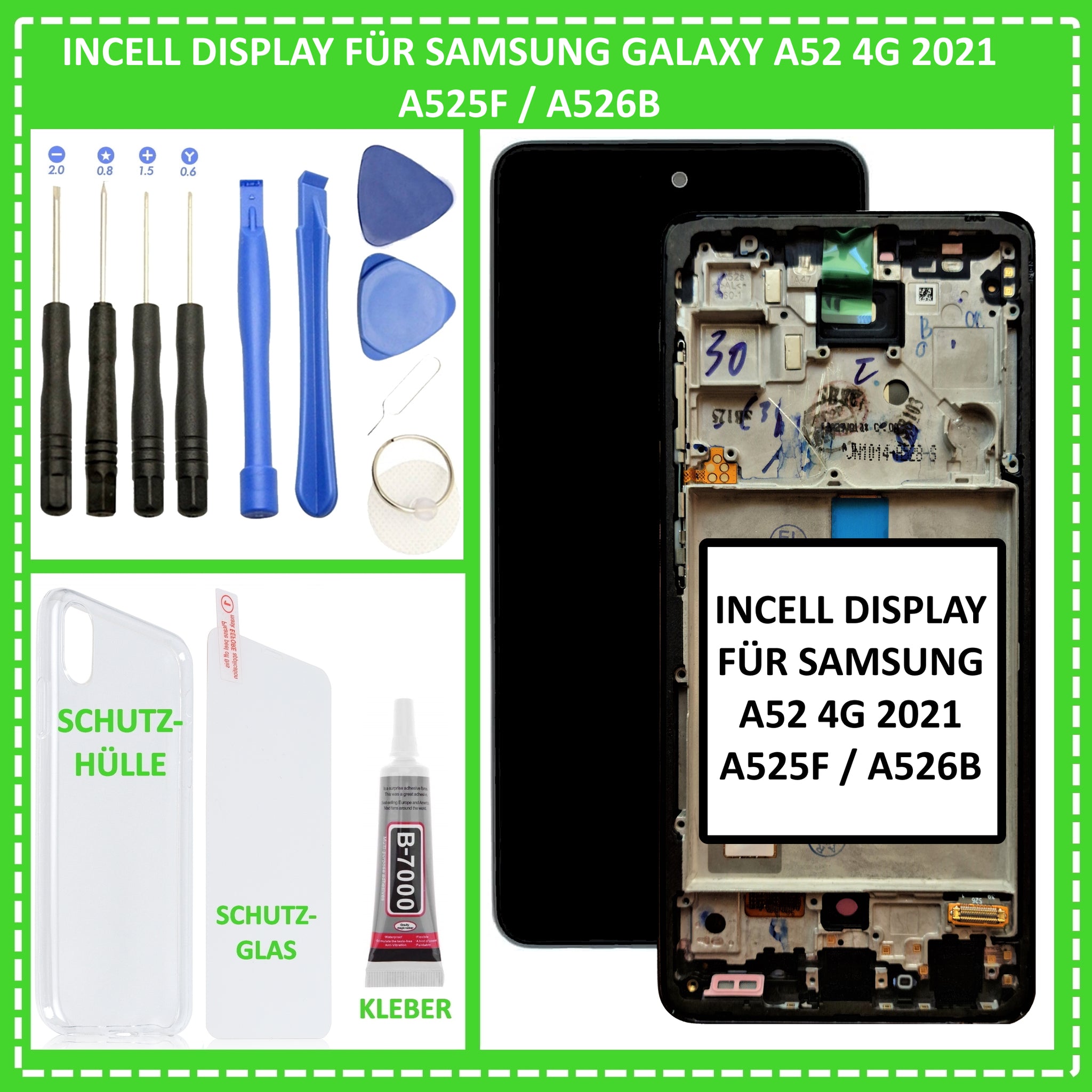 Ihnen ist Ihr Samsung Galaxy A52 4G 2021 (SM-A525F / SM-A526B) heruntergefallen, sodass dabei das Display beschädigt wurde? Eine Reparatur in einer Fachwerkstatt ist Ihnen zu teuer ? Dann sind Sie hier genau richtig. Mit unserem Incell Display Reparatur Set haben Sie nun die Möglichkeit Ihr Display einfach und kostengünstig selber zu reparieren. Hierzu verwenden Sie einfach das mitgelieferte 10-teilige Werkzeugset und die B-7000 Klebetube. Zudem erhalten Sie gratis noch ein passendes Schutzglas und eine Silikonhülle dazu. Außerdem ist das Display bereits einbaufertig. Das heißt, dass das Display bereits vollständig und mit dem Rahmen verklebt geliefert wird. Es ist nagelneu und vollständig auf Funktion geprüft.